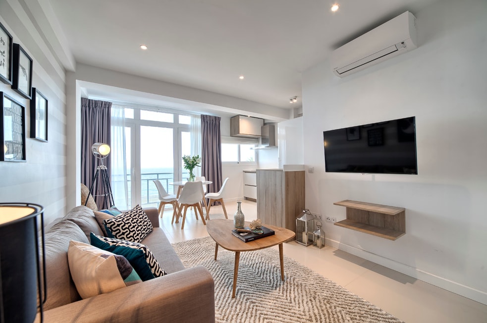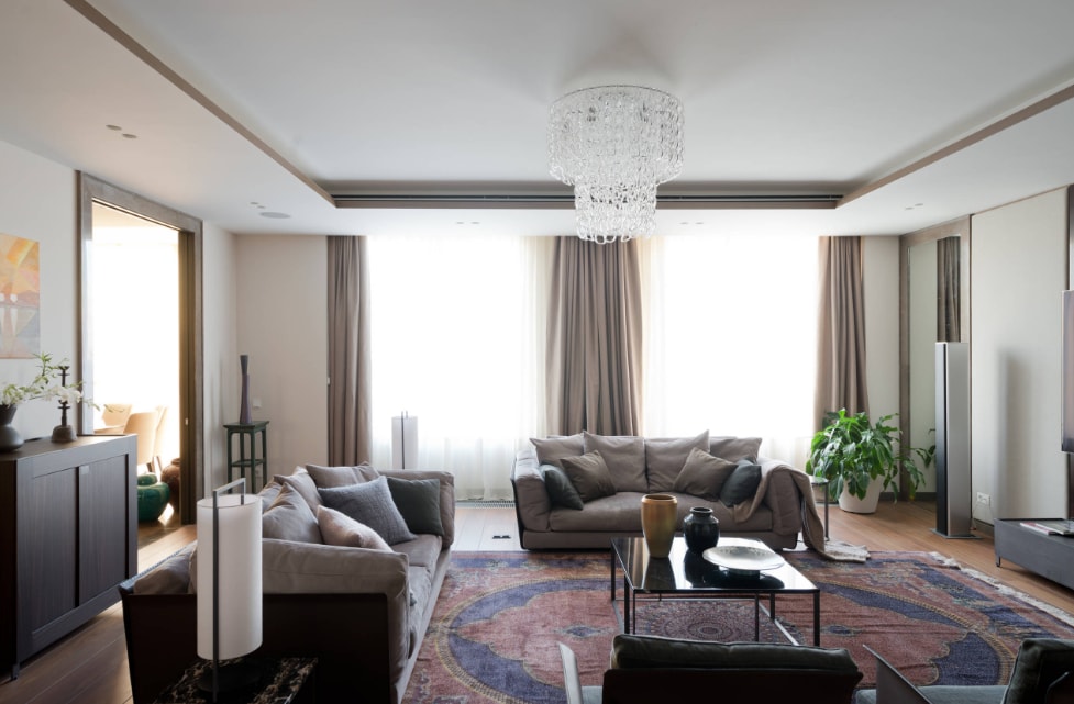 Благодаря такому расположению окон ваша гостиная в любое время суток получает достаточно света. А это значит, что может возникнуть необходимость хотя бы частично закрывать шторы.