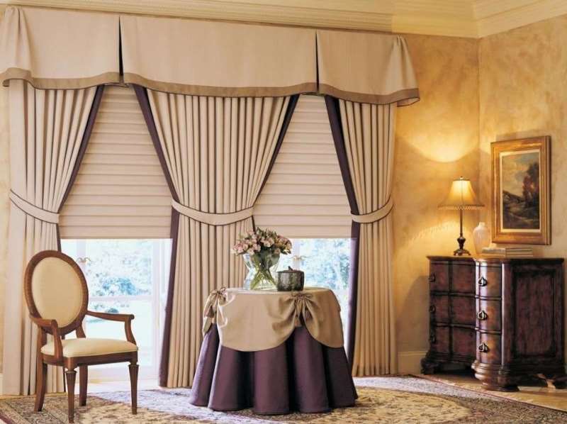 Комбинации разных тканей. Особенно хорошо смотрятся более тяжёлые с легкими, полупрозрачными. Такой приём рекомендовано использовать для окон от пола до потолка. Именно в этом случае стильно смотрятся в зале модные бежевые шторы в сочетании с полупрозрачными льняными занавесками-тюлем. Либо шторы другого современного оттенка.