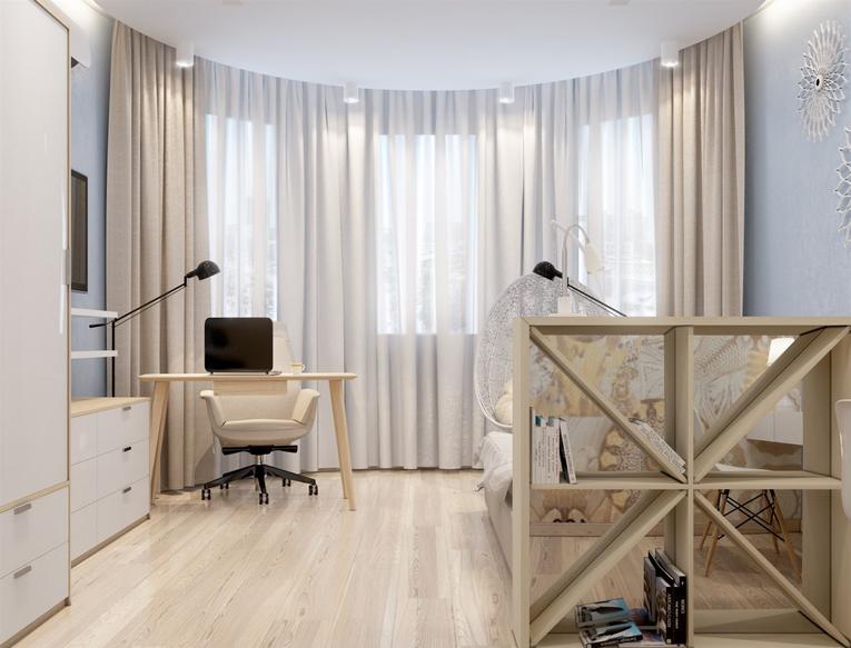 Элегантным и функциональным решением будут светонепроницаемые занавески с изящным ламбрекеном. Причем можно использовать как одну, так и несколько портьер, закрепленных на эркерном или на потолочном карнизе.