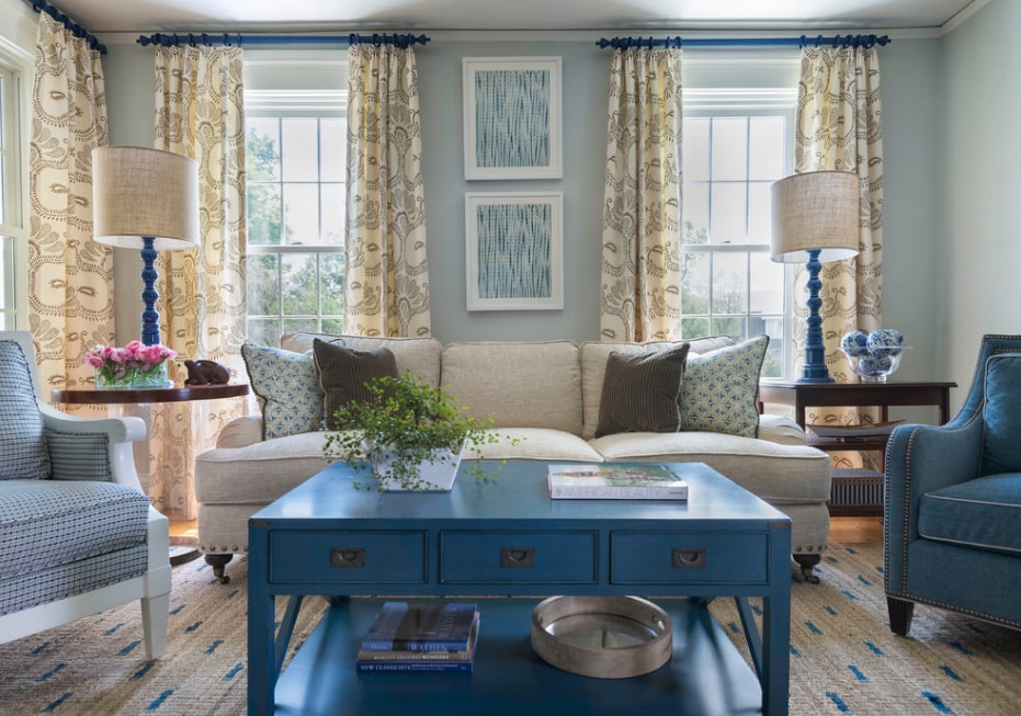 · Тюль, повторяющий рисунок гардин — интересное решение, создающее иллюзию градиента на окне.