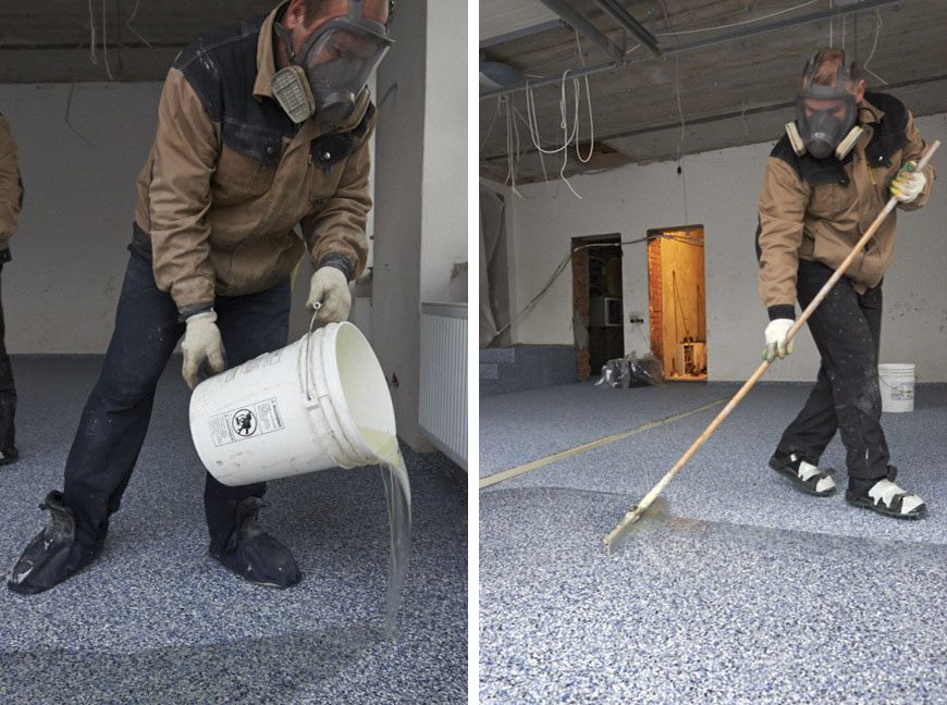 Полимерный слой наносится, распределяется по поверхности и сразу же выравнивается. Проводится повторная засыпка и распределение чипсов по полу, излишки в дальнейшем будут удалены. Эту работу выполняют в специальной обуви — краскоступах. Они не оставляют никаких следов на покрытии. Любая другая обувь для данной работы запрещена.