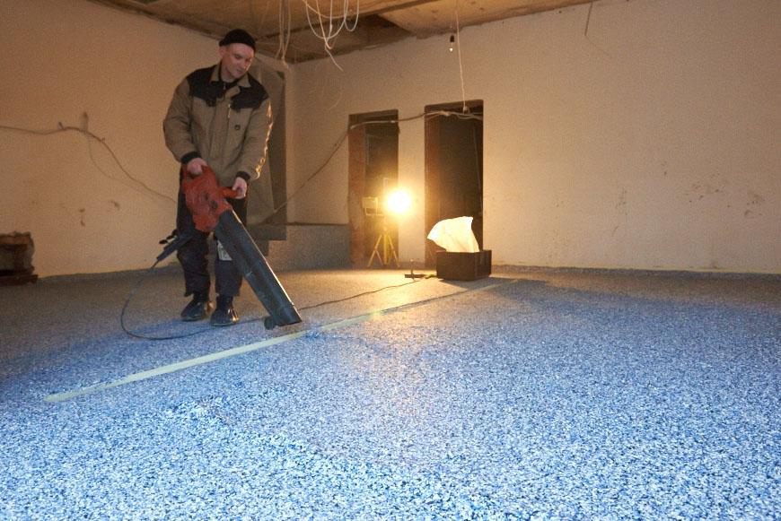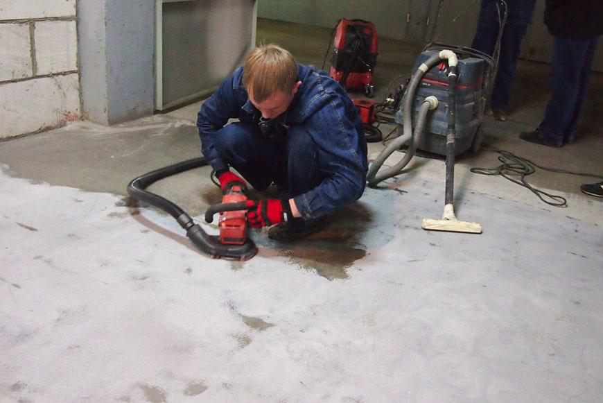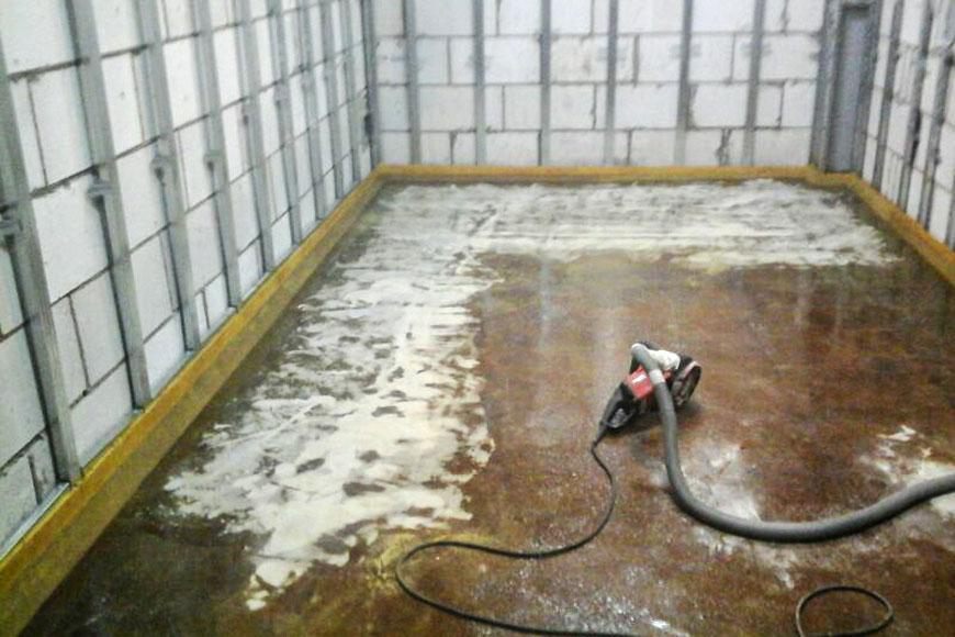 - Подготовка поверхности. С пола счищаются слишком выступающие бугорки раствора или краски (более 5 миллиметров). Большие углубления необходимо зацементировать.