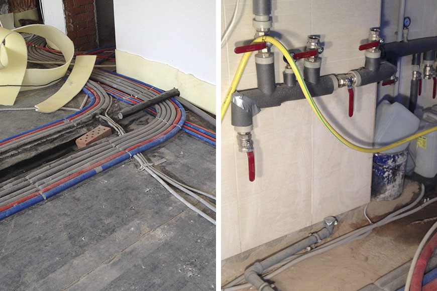 Для организации системы теплого пола при водяном отоплении используют пластиковые трубы, которые проводят внутри перекрытия по всему дому и организовывают центр управления системой, чтобы регулировать работу всех элементов.