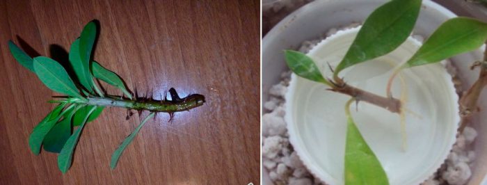 Размножение черенками происходит в начале лета. Срезав побег, следует сразу опустить его в теплую воду, чтобы стек ядовитый сок. Место среза нужно посыпать толченым углем, чтобы в рану не попали бактерии. На протяжении нескольких дней побег подсыхает, а потом его высаживают в готовый субстрат посередине горшка. Оптимальная температура для укоренения — +20-25 градусов. В первый месяц нужно как можно меньше тревожить растение и дать адаптироваться к новым условиям.