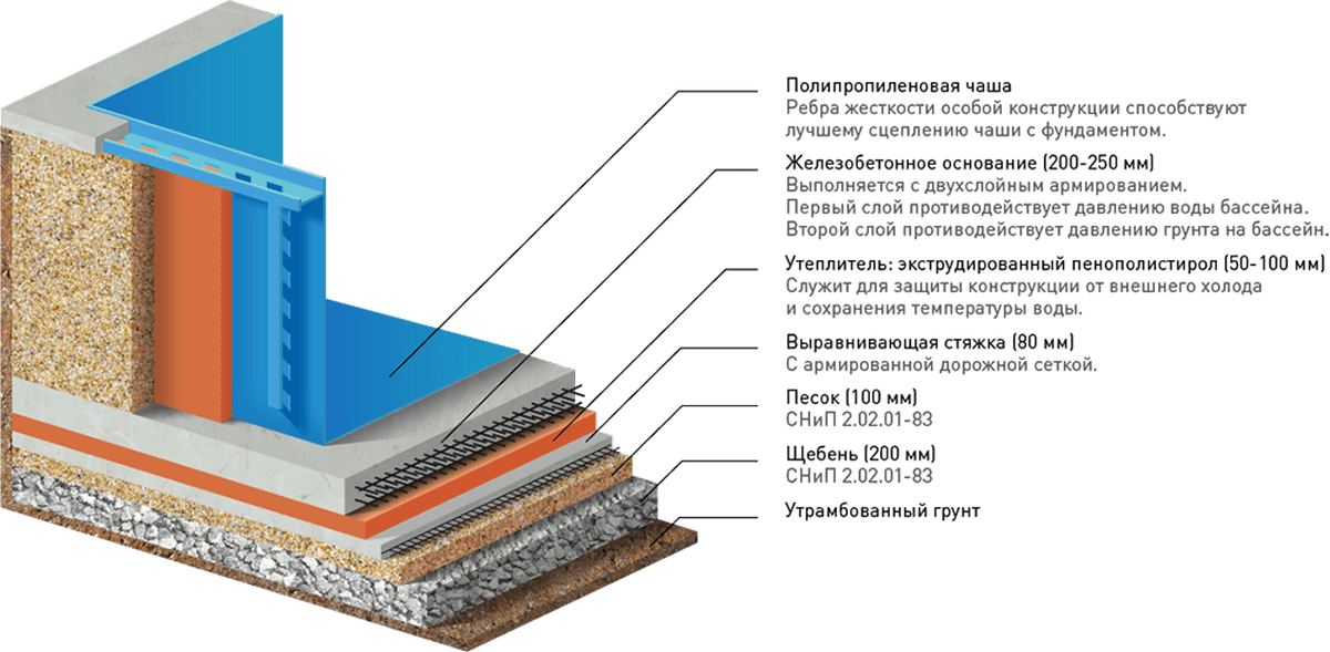 Конструкция из этого материала, помещённая в подготовленный котлован, не требует установки удерживающего каркаса или опалубки. Для этого достаточно укрепить стороны чаши бассейна бетонной смесью.