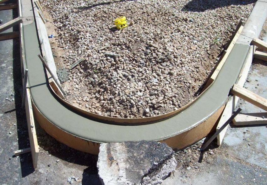 После установки бордюра для фиксирования с обеих сторон заливают бетонную смесь, в состав которой входит песок и щебень мелкой фракции