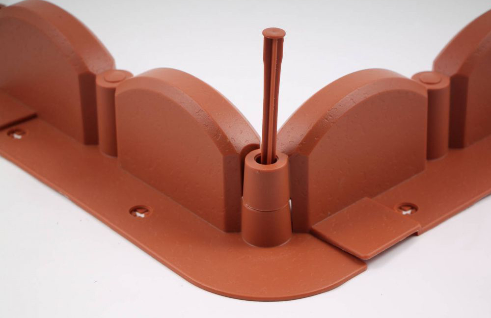 Еще один тип популярных пластиковых бордюров выполнен в виде панелей длиной 3 метра, оснащенных крепежными отверстиями в нижней части. В эти отверстия забивают пластиковые штыри. Такой бордюр отличается гибкостью, его часто используют при укладке тротуарной плитки с криволинейными формами дорожек.