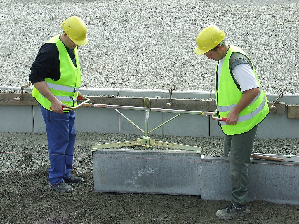 Переходим к выставлению бордюров. На этом этапе уже понадобится бетон. По опыту, лучше брать бетон марки М-250 или, в крайнем случае – М-200. Его небольшими кучками выкладывают в траншею по линии установки бордюров, в тех местах, где должны быть их стыки. На эти бетонные «возвышенности» и устанавливаются бордюрные камни. При установке бордюра в траншею используются специальные клещи — нечто типа больших ножниц с загибами на концах. Эту операцию выполняют два человека, «вооружённые» такими клещами. Одному с такой процедурой не справиться, ведь дорожный бордюр весит порядка 120 кг! При установке следует соблюдать величину зазоров между бордюрами 1-3 мм.