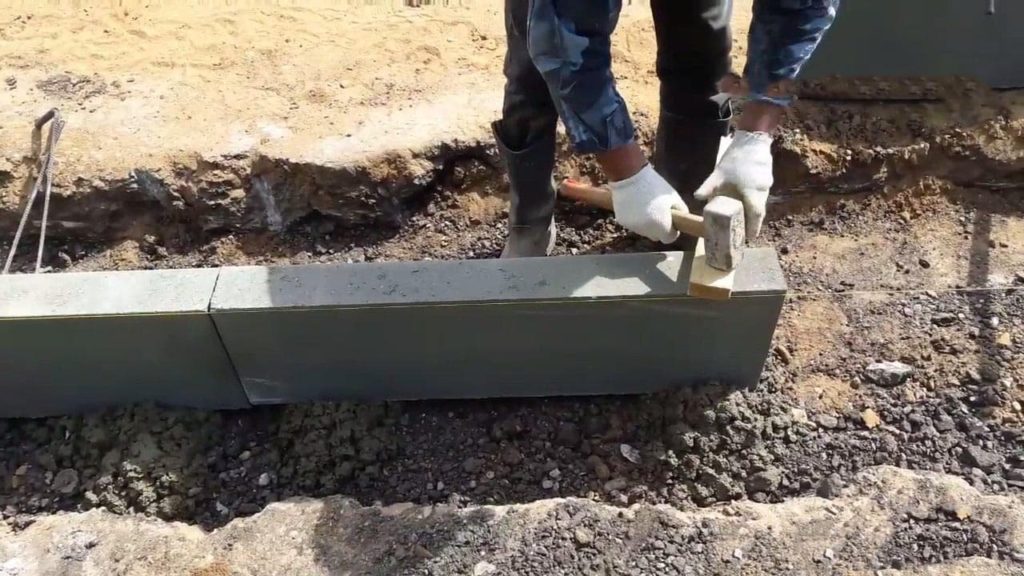 Пока бетон не «стал» есть возможность подправить установленный на «ляпушки» бордюрный камень — сместить его вправо-влево, скорректировать угол его наклона и высоту. Для этих целей применяются резиновые молотки. Другой твердый инструмент может повредить, расколоть бордюр.
