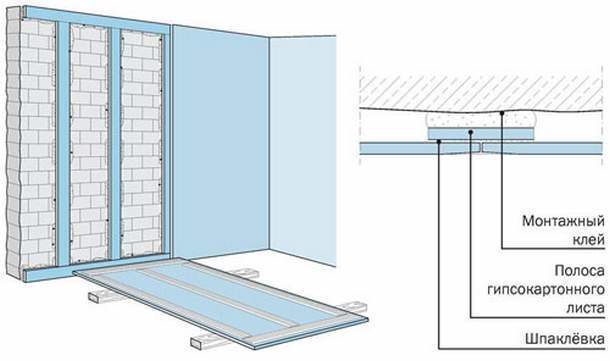 Схема крепления гипсокартона на клей.