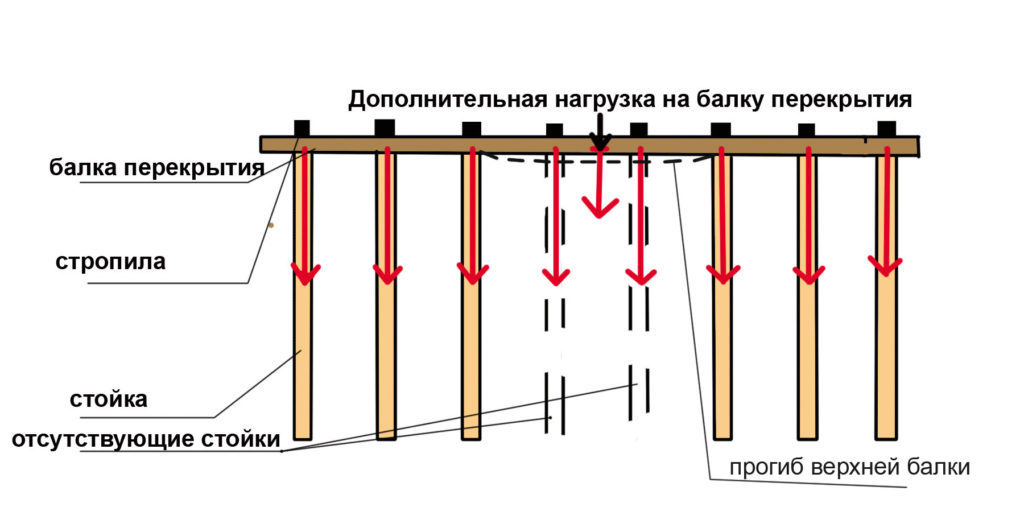 Это вызывает перераспределение нагрузок. Там, где стойка отсутствует, на верхнюю балку нагрузка увеличивается, и балка стремится к прогибанию.