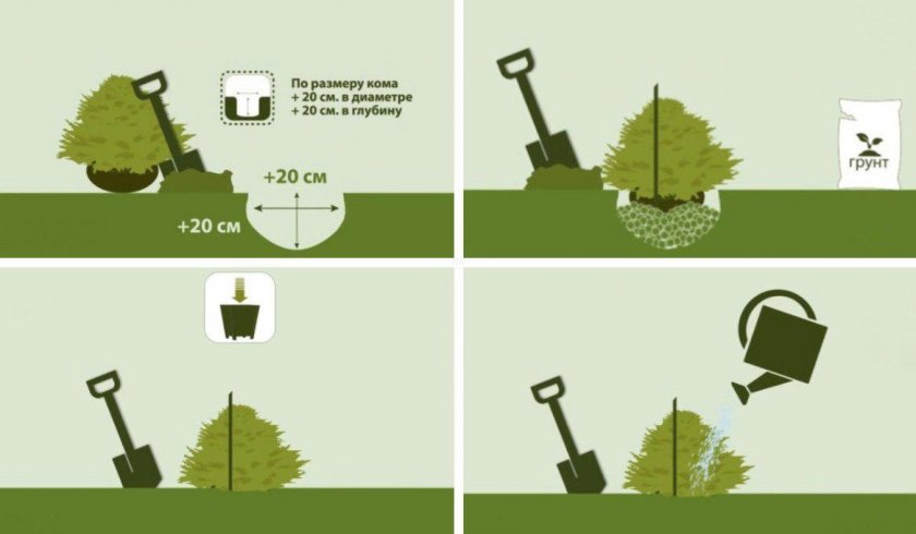 Яму для посадки необходимо подготовить заранее. Ее глубина не менее 50 сантиметров, а диаметр должен превышать размер земляного кома минимуму в два раза.