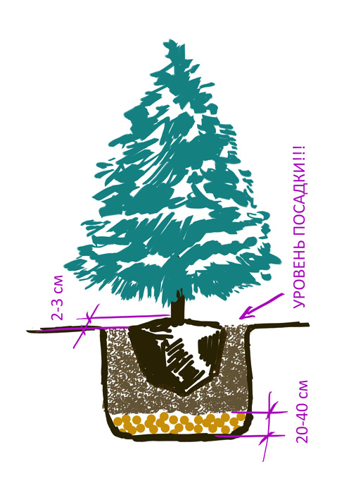 Засыпаете до уровня – верхнего уровня кома. Корневую шейку при посадке не заглубляют (при заглублении кора на стволе отмирает и питание перестает подаваться к растению – ель погибает).