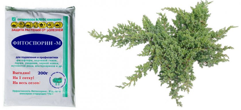Ним необходимо проводить обработку при появлении первых признаков болезни. Если препарат в виде порошка, то 5 г растворяют в ведре воды. Пастообразный препарат готовят в пропорции 3 ст. ложки на ведро. Кроме болезней, на растении могут появляться вредители: можжевельниковая тля, европейская можжевельниковая щитовка, можжевеловая моль. Для борьбы с ними применяют препараты «Конфидор», «Энжио», «Калипсо» (1–2 мл препарата на 5 л воды).