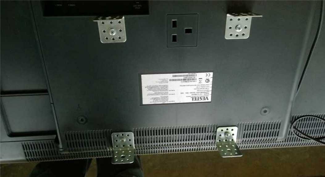 Чтобы не мучатся с подгонкой отверстий, можно найти монтажные уголки с перфорацией. Купить их надо будет восемь штук — по два на каждое крепежное отверстие. Четыре закрепить на телевизоре, четыре — на стене. Далее навешиваем, вставляем в отверстия крепеж для фиксации (обычно — болты небольшого диаметра).