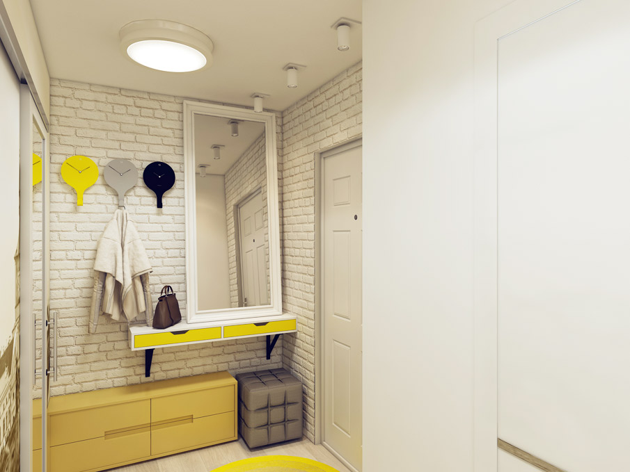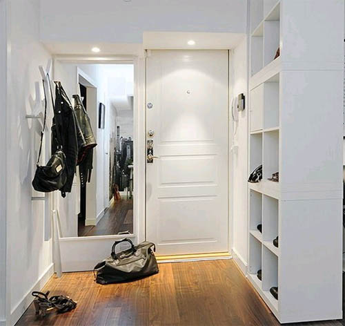 Зона с входной дверью является первой. Данный сегмент оснащается выключателем и достаточным количеством света, что обеспечивает удобный поиск одежды и обуви.
