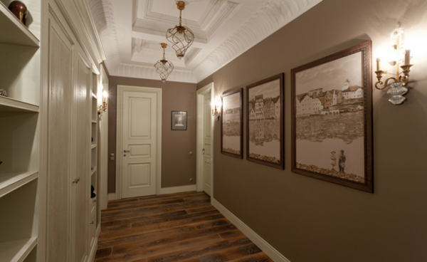 Он создает ощущение темного тоннеля, поэтому важно подобрать правильное освещение. Вдоль коридора можно установить споты или другие точечные светильники, направленные в сторону стен или висящих рамок и зеркал