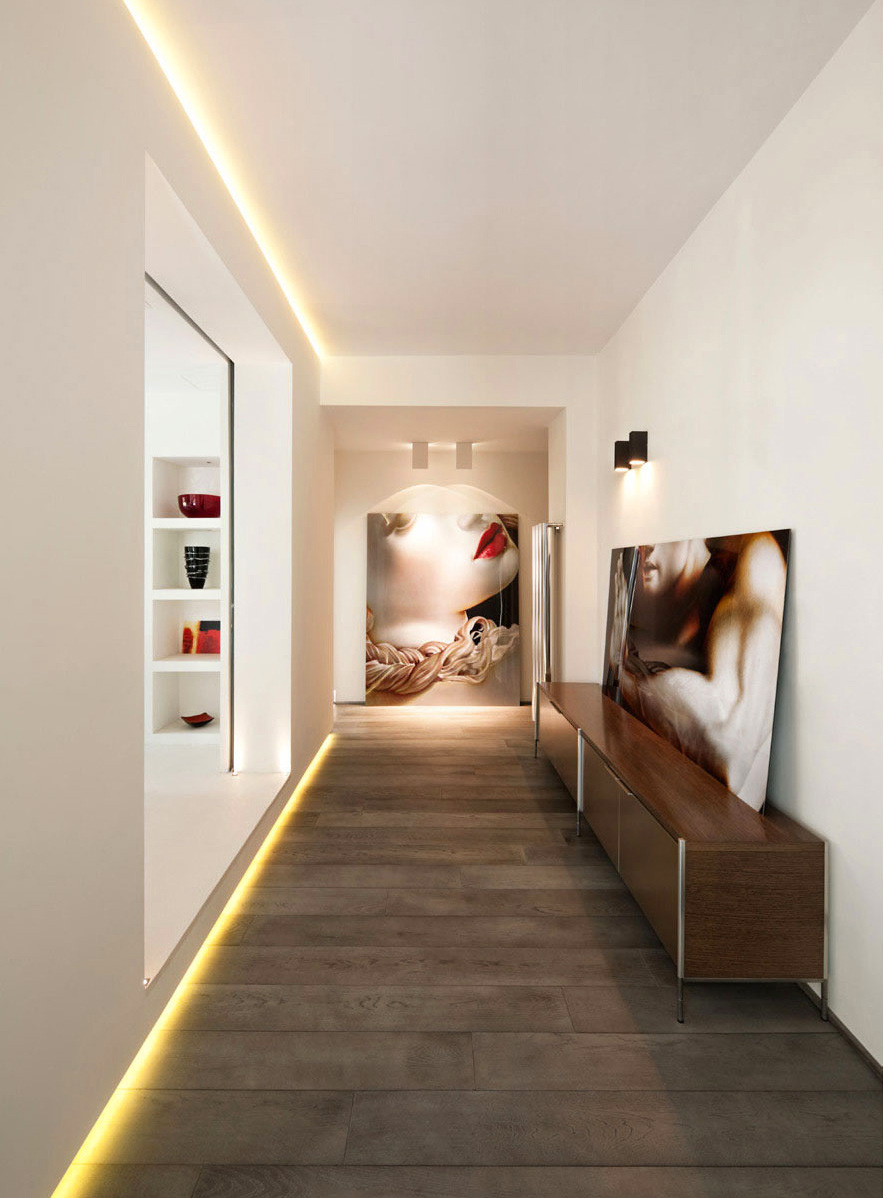 Можно дополнительно подсветить предметы интерьера – это поможет визуально сократить длину коридора.