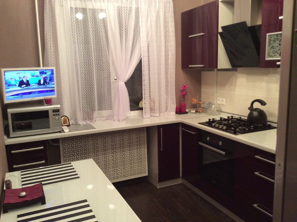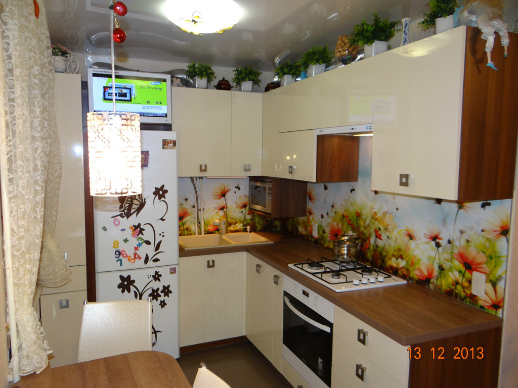 Хочется обратить ваше внимание на то, что глянцевые потолки на кухне в хрущевке получаются без швов из-за малых размеров комнаты