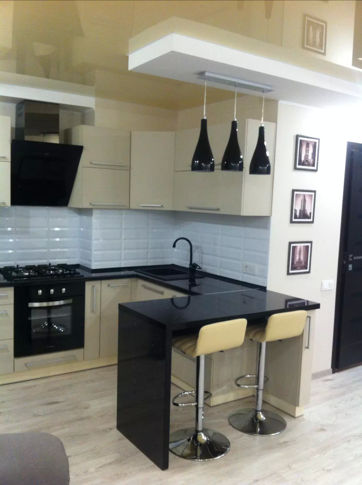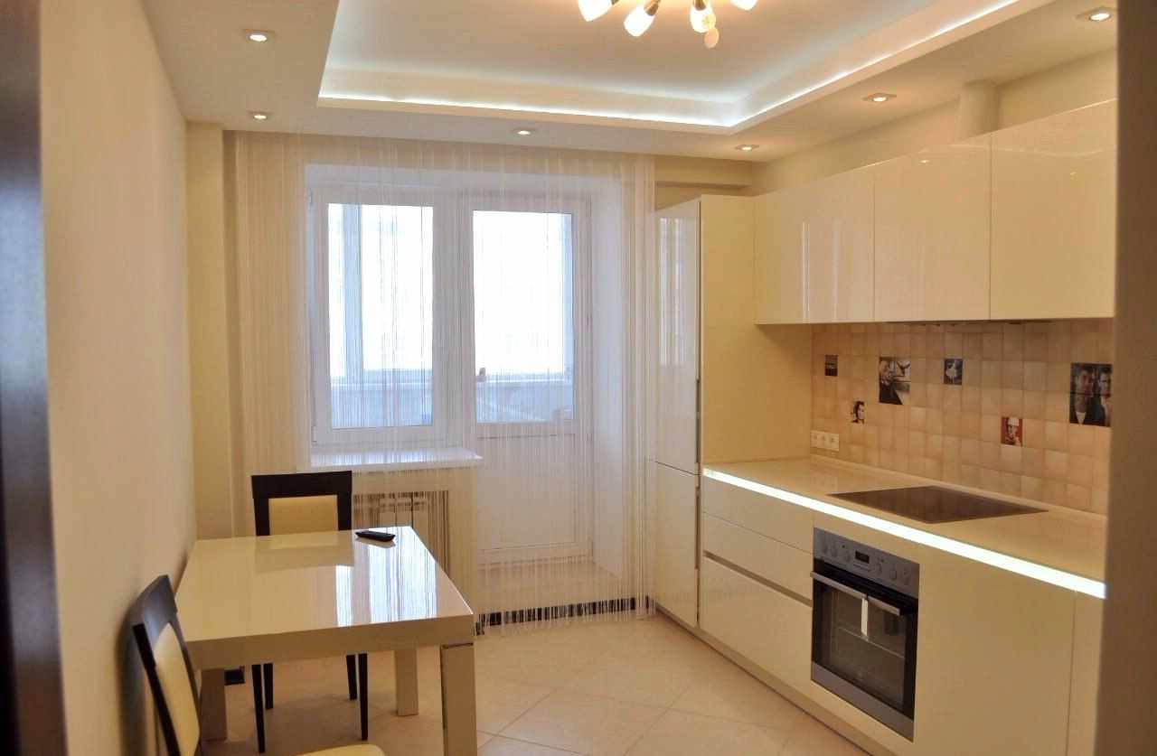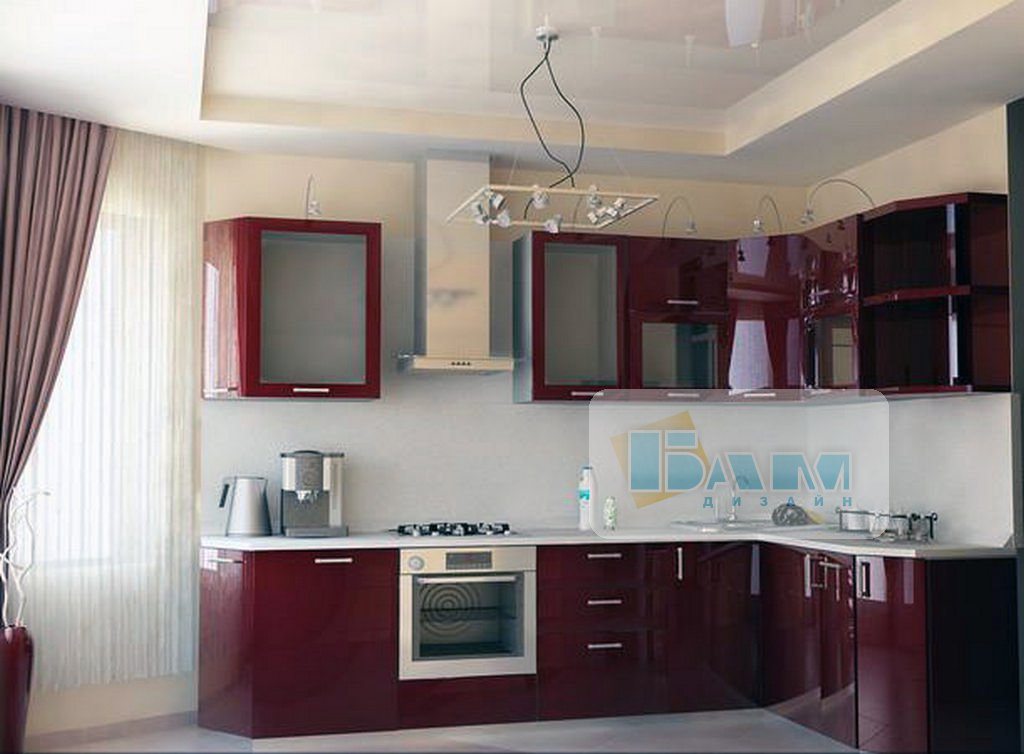 Глянцевый натяжной потолок на кухне