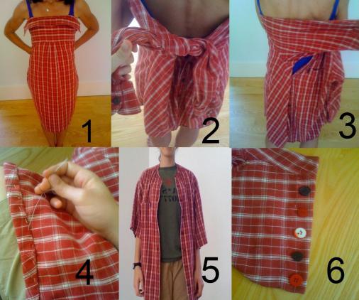 - Приложите спину рубашки к себе (иллюстрация 1). Ворот должен быть на уровне груди. Он будет выполнять функцию лифа платья.