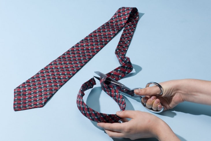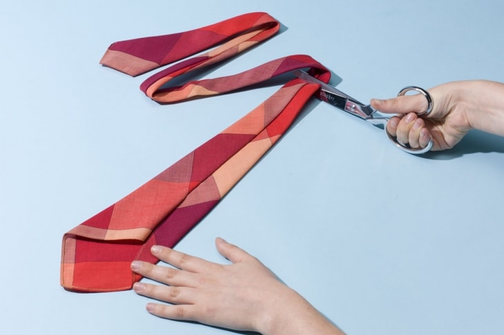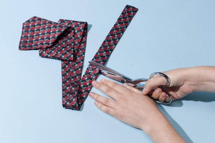 Второй галстук используем для создания красивого бантика. Для этого отрезаем широкую часть материала.