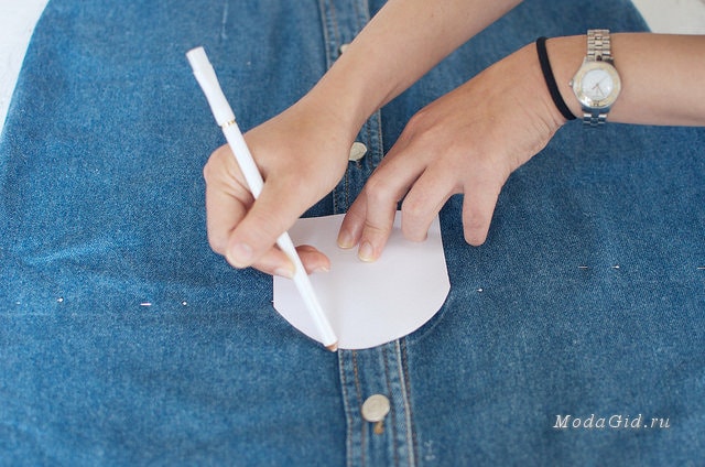 Начиная с середины юбки, обводим картонный шаблон, подготовленный заранее.
