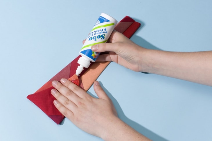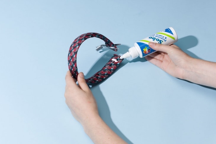 Подклеиваем края галстука на обруче и используем зажимы для лучшей фиксации.
