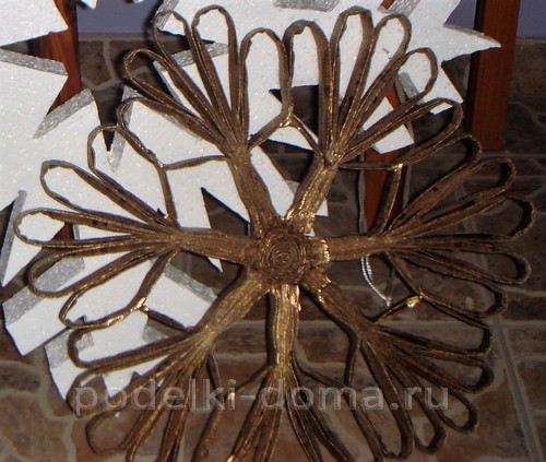 Вторая поделка склеена из газетных полосок. Для этого листы газеты разрезаются по длинной стороне на 2 или 3 равных части, каждая сворачивается несколько раз, чтобы получилась плотная полоска. Из полосок равной ширины сворачивается середина, а к ней приклеиваются лучики. Сверху снежинка окрашена золотистой краской из баллончика и покрыта лаком для прочности.