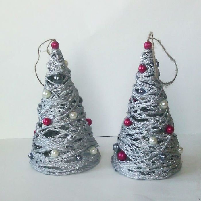 Еще необычнее и интереснее смотрятся на елочке новогодние украшения из ниток, которые, несомненно, найдутся в каждом доме.
