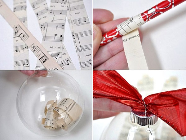Также пригодились три прозрачных шара, которые сын захватил с собой вместо коробки с машинками. Ну а так как наша бабушка — учитель музыки, мы выпросили у нее парочку нотных листов, чтобы использовать их для декора.