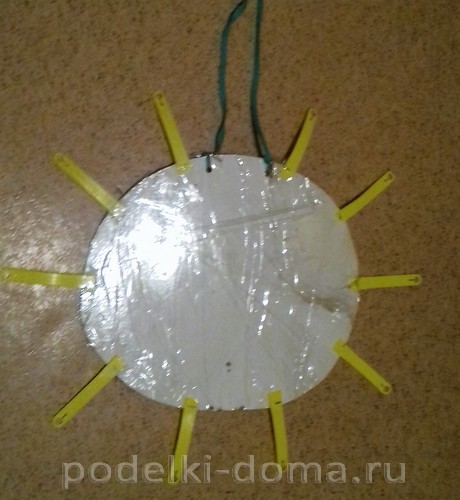 Материалы для работы: одноразовые пластиковые стаканчики — 180шт., фольга алюминиевая, блёстки из мишуры, верёвка, степлер и скобы.