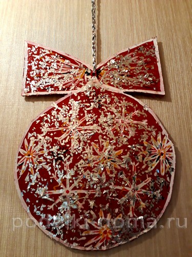 - Надень обратно крепление, завяжи ленту в виде пышного банта. Прикрепи к шару декоративный шнурок, чтобы его можно было повесить на елку.