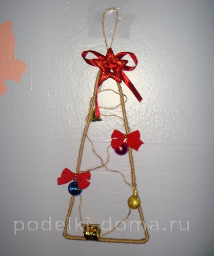 Первый вариант этой игрушки выполнен из проволоки, задекорированной бечевкой. Украшениями служат пластиковые разноцветные шарики и яркие бантики.
