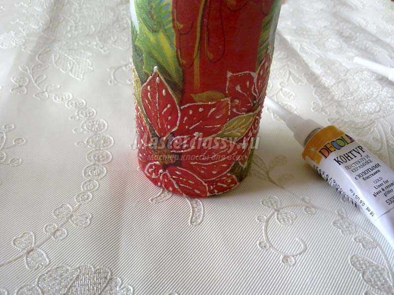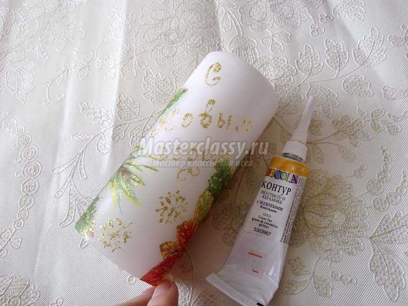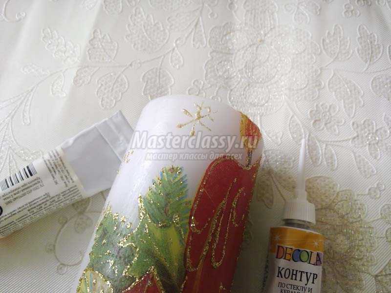 Когда рисунок приклеен, можно приступать к декору. Используя восковые или акриловые контуры, следует расставить акценты в изображении, выделив некоторые элементы. Также с их помощью можно сделать надпись и нарисовать снежинки.
