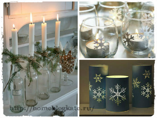 Следующий вариант также не сложный. В данном случае используются стеклянные емкости, в том числе и обыкновенные бутылки. В их горлышко идеально встают длинные свечи. Места стыков можно украсить веточкой хвои, лентами, нитками и бусами. Широкие объёмные стаканы отлично подойдут для затемнения. Для этого достаточно из бумаги вырезать фигуры и приклеить на внешнюю сторону подсвечника. Как вариант, такой декор можно постоянно обновлять и никому в голову не придет, что это одни и те же свечи.