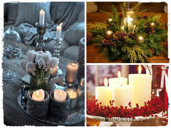 Композиция, включающая новогодние декоративные элементы – беспроигрышный вариант. Особенно он будет к месту на столах и журнальных столиках. Смотрятся они великолепно и оригинально подчеркивают новогоднее праздничное настроение. Изготавливаются они легко, можно взять даже простой подручный материал. В итоге получится супер украшение из свечей.