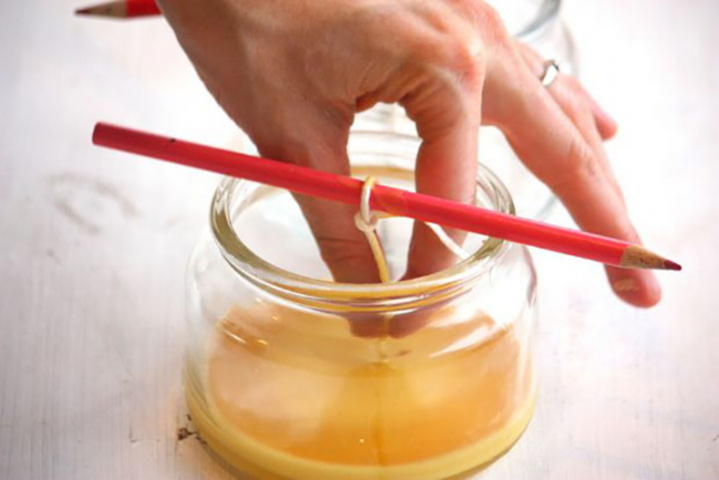 Последний – и самый важный элемент – это фитиль. Вставлять его следует не сразу, иначе есть угроза того, что его кончик, который должен остаться над поверхностью, утонет в геле, а если ваш фитиль армирован, то есть имеет тоненькую проволоку внутри, он может просто неудачно накрениться. Когда масса подостыла – можно устанавливать фитиль.