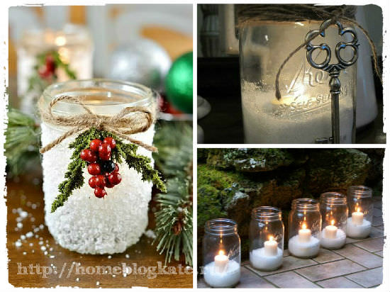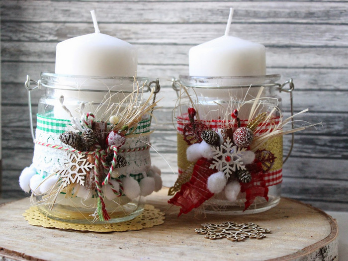 Даже простая стеклянная банка подвязанная лентой с шишкой, с присыпанной солью на смоченной клеем поверхности, имитирующей снег, перестает быть хозяйственной емкостью. Да и круглые бокалы выполнят функцию подсвечников, если внутрь положить маленькие парафиновые свечки. А декорируя стенки бокалов блестками, вы получите мерцание свечи более интимное и загадочное.
