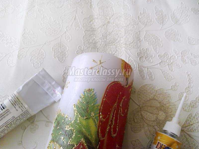 Для украшения наружной части свечи можно использовать краски, яркие блестки, бисер разных форм и размеров. Если вы нашли интересные новогодние картинки, можете тоже использовать их для декорирования свечи. Этот процесс называется техникой «декупаж». Декупаж свечей своими руками к новому году – еще один способ украсить праздничный стол, комнату, где соберутся гости и домочадцы в новогоднюю ночь, чтобы отметить наступление праздника.