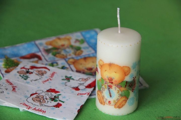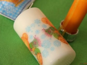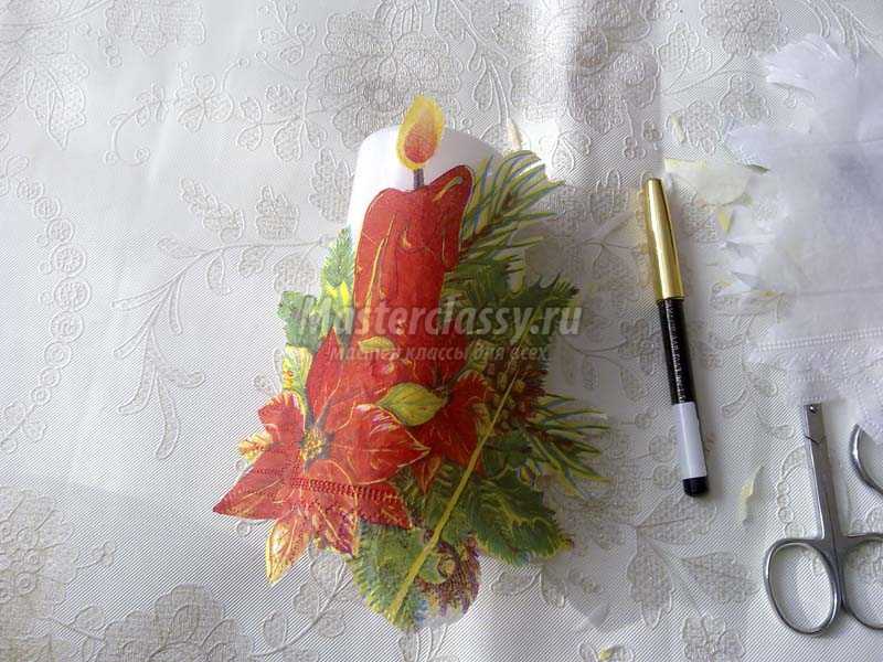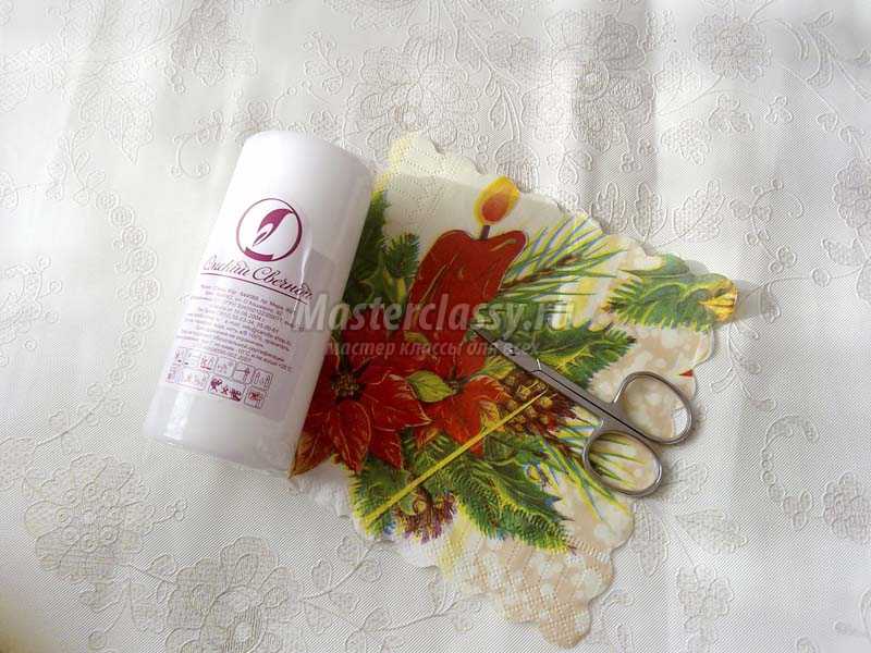 Чтобы изготовить свечу в такой технике, следует подготовить необходимые материалы. Главное – выбрать свечу, изготовленную по современной технологии, которая при горении не образует подтеков по бокам. Также следует подобрать трехслойную салфетку с новогодним рисунком в соответствии с размерами свечи, ножницы и кальку, тряпочку из махры, контуры для рисования, карандаш без углов и обычный фен.
