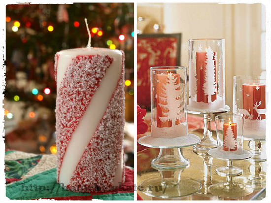 На западе очень популярны новогодние свечи красного цвета. Они буквально есть в каждом доме, причем разных форм и с разным декором. Толстые хорошо смотрятся в специальных стеклянных подсвечниках, которые не только украсят помещение, но и обеспечат безопасность. Узкие и маленькие чайные свечки отлично украшают подставки различных тематик. Их можно приобрести в магазинах либо сделать своими руками.