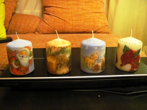 Впрочем, гелевыми свечами праздничные новогодние свечные поделки не ограничиваются. Есть масса других оригинальных решений для «нарядных» свечей. Например, декупаж или скрапбукинг.