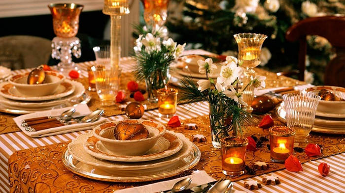 Поскольку главный цвет нового года – это желтый, изобилие таких оттенков не будет лишним в новогодней сервировке. Наиболее гармоничным будет сочетание желтых элементов с коричневыми, белыми и золотыми деталями: использовать большее число оттенков в декоре нежелательно, чтобы не создать цветовую перегрузку.