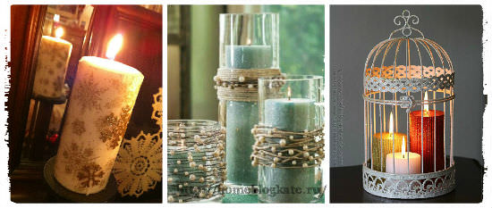 Подробных мастер классов вы здесь не найдете. Во-первых, по фотографиям и так все понятно, во-вторых, мне хотелось дать вам максимум информации и идей для декора. Кстати, если вы не знаете, как сделать своими руками обыкновенную свечу, то обязательно прочтите вот эту статью, там и есть та самая пошаговая инструкция.