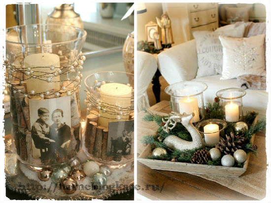 А чтобы твой дом засиял еще краше, можно налить немного воды в зеленые стеклянные чашечки и опустить в них свечи. После этого следует поставить чашечки на поднос и разложить вокруг них елочные игрушки. Смотреться такое украшение будет просто великолепно!