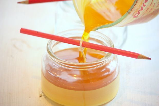 После этого дайте гелю загустеть и застыть. Лучше поместить свечу в тёплое место – это поможет выгнать пузырьки из её основы. Пара-тройка часов – и свечу можно зажигать.