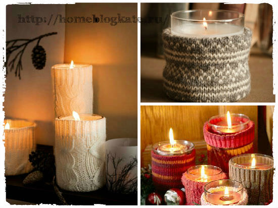 Начну с самого простого и незамысловатого, но очень классного способа декора, это “вязаный” декор. Можно взяться и отдельно связать такие чехольчики на подсвечники, а можно использовать старые свитера или даже носки для украшения, предварительно вырезав деталь по размеру. Согласитесь, такие свечи очень милые, а смотрятся просто великолепно.