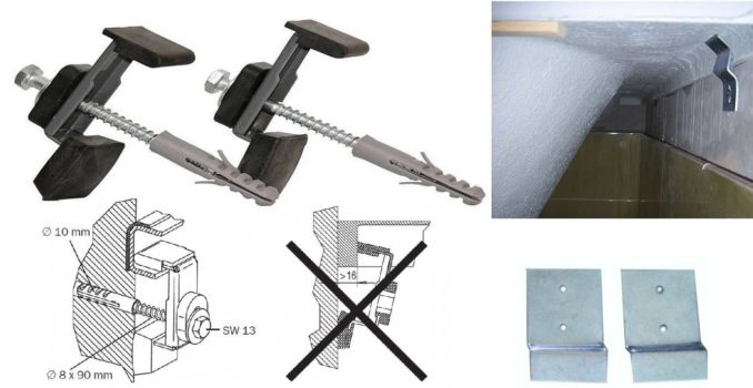 - Ориентируясь по отметкам на стене, устанавливают устройства для фиксации края ванны. При этом не забывайте, что стенки ванны также имеют толщину. Если крепеж жесткий, без резиновых краев, это необходимо учесть.