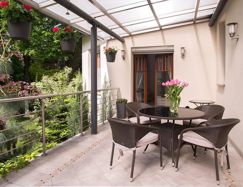Площадка под навесом оформлена при помощи стилизованного под камень глазурованного керамогранита